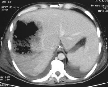 - Компьютерная томография или УЗИ позволяют визуализировать пространство с гнойной жидкостью в печени вместе с сопутствующим отеком. Опытный специалист должен отличить абсцесс печени от возможных опухолей или кист.