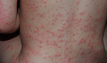 - Сыпь. При разных формах недуга сыпь может отличаться. Она может быть мелкой или крупной и состоять из волдырей алого цвета, с ярко-красной или белой окантовкой, что характерно для острой крапивницы. Иногда сливаться, образуя большие пятна. При гигантской крапивной лихорадке волдыри могут достигать огромных размеров, а при папулезной дополняться папулами.
