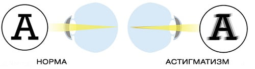 Астигматизм — эта аномалия рефракции, возникающая из-за неправильной формы роговицы или хрусталика и проявляющаяся размытой картинкой окружающих объектов. Диагноз «астигматизм» выставляют при снижении остроты зрения на 3 дптр и выше и при подтвержденной аномалии формы роговицы или хрусталика.