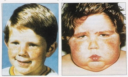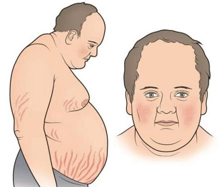 Человек с болезнью Иценко-Кушинга постепенно приобретает достаточно специфическую внешность — лунообразной формы красное лицо, тучное туловище с тонкими конечностями (см. фото).