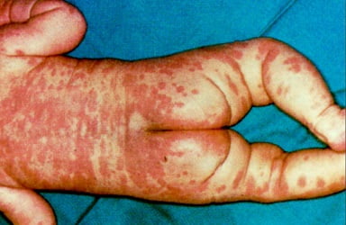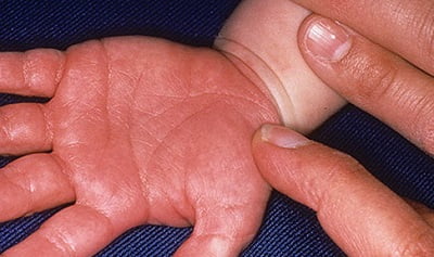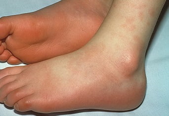 Примерно через 2 недели после появления лихорадки у ребёнка могут появиться уплотнения с шелушащейся кожей на ладони или подошвах.