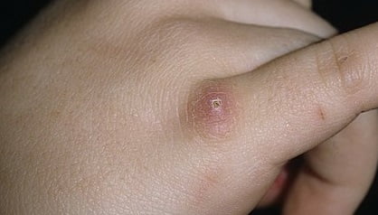- Через время, понадобившееся микробу для проникновения и накопления (3 дня-3 недели, в среднем — 7-14 суток) на том месте, где была царапина или остается корочка от нее, появляется сыпь. Она выглядит как несколько узелков размером от просяного зерна до горошины, которые не зудят и не болят.