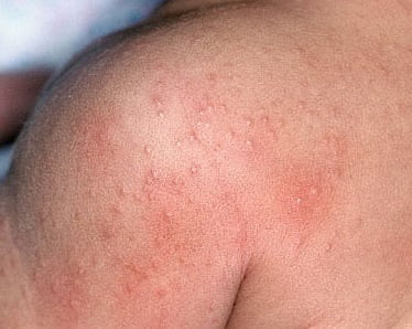 - Высыпание (экзема). Морфология сыпи и её локализация типичны для конкретного дерматита. Наиболее частая локализация высыпаний — подвижные части тела (кожа над суставами), лицо, волосистая часть головы, бока туловища, паховая область.