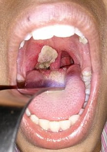Дифтерия ротоглотки является самым распространенным видом заболевания у взрослых и детей (90–95 %). Начало заболевания напоминает ОРЗ и протекает с умеренной интоксикацией: больной чувствует недомогание, головную боль, отсутствие аппетита; кожа становится бледной, появляется тахикардия, нёбо и миндалины отекают.