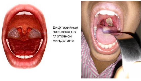 На миндалинах появляется светлая пленка (фиброзный налет), напоминающая паутину, но с развитием болезни (на второй день), налет сереет, уплотняется; удалить пленку довольно сложно, так как слизистая может кровоточить. Спустя 3–5 дней дифтерийная пленка становится рыхлой, снять её становится легко; лимфатические узлы увеличиваются, при пальпации у больного возникают болезненные ощущения.