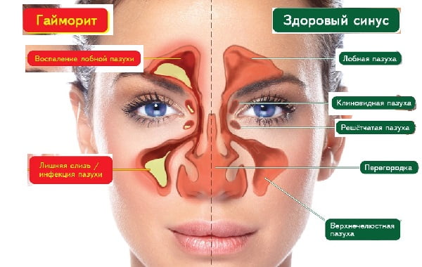 Гайморовы пазухи представляют собой полости, сообщающиеся с носом через узкое отверстие. Выравнивая давление между внутричерепными полостями и атмосферой и участвуя в голосообразовании, гайморовы пазухи вдобавок увлажняют воздух, поступающий в дальнейшем в легкие. Вследствие закупорки сообщающего с носом отверстия в пазухах скапливается слизь, что приводит к воспалению и характерной симптоматике.