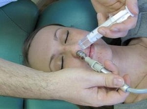 - Перед процедурой носовую полость очищают от слизи. Закапывают сосудосуживающие капли, для того чтобы снять отек.