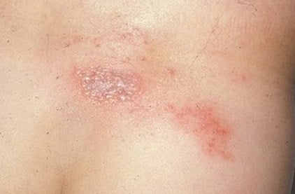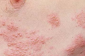 Затем наступает период высыпаний, когда появляются герпетиформные пузырьки на коже по ходу нервов. Причем, когда происходит размножение вируса герпеса на теле, симптомы могут распространятся сразу на нескольких нервных стволах. Излюбленной локализацией опоясывающего герпеса является проекции межреберных нервов, тройничный нерв на лице, иногда бывают высыпания на бедрах и в области гениталий. Сыпь напоминает группы везикул, которые располагаются на уплотненной покрасневшей коже, внутри пузырьков содержится серозная жидкость.