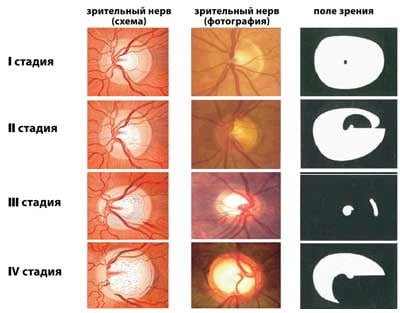 - I стадия (начальная) — изменения в периферическом зрении отсутствуют, но есть небольшие в центральном (парацентральные скотомы, в зоне Бьеррума, расширение слепого пятна), экскавация соска зрительного нерва, не доходящая до его края.