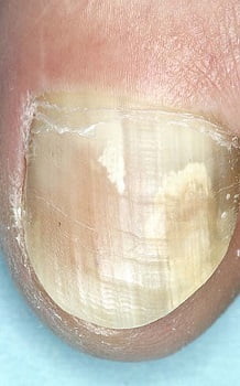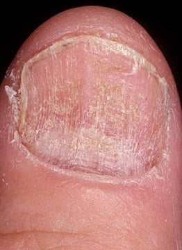 Грибок проникает под ногтевую пластину со стороны свободного края и постепенно распространяется к корню. Ноготь утолщается, меняет цвет, теряет прозрачность и может начать отслаиваться от ложа. Проксимальный подногтевой. Поражение начинается у основания ногтя в зоне лунки.