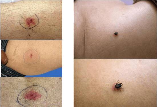 Достаточно легко распознать место укуса клеща у человека, инфицированного боррелиозом. Место вокруг укуса напоминает эритему. Пятно может увеличиваться в диаметре в среднем до 15-20 см. Иногда красное пятно может достигнуть и 60 см, покрывая не только место укуса, но и значительную часть тела. Пятно в таком случае может иметь любую форму. Характерный признак укуса клеща, перенесшего боррелиоз — возникновение отчетливой кровавой каймы вокруг пятна на коже. При этом вся центральная часть пятна приобретает белёсый или нездоровый, синюшный цвет.