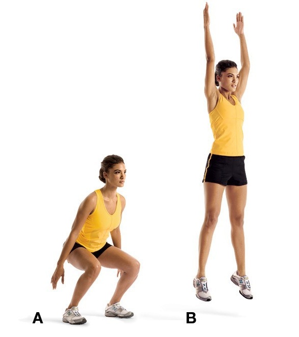 - для среднего уровня подходит следующая тренировка. Разомнитесь, бегая по дорожке около 3 минут. Затем чередуйте минуту прыжков из приседа с минутой отдыха, 6 циклов. После этого чередуйте 12 повторений приседания с грифом или штангой и минуту отдыха. Проделайте 10 циклов. Завершите тренировку 20-минутной ходьбой по дорожке с уклоном от 8 до 16%.