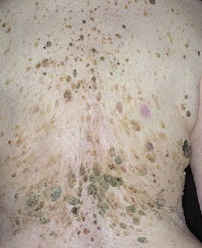- Сенильная или старческая кератома — множественное образование с беловатым или серым оттенком. Возрастные наросты появляются у людей после 30 лет, обычно на шее, лице, кистях с тыльной стороны, реже на животе, спине, груди и ногах. Через некоторое время образование может увеличиться в размерах и покрыться бляшками. Старческая кератома склонна к воспалению, но редко приобретает злокачественную форму.