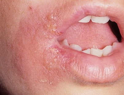 - Начальная стадия — проявляется общим недомоганием и местными симптомами в области рта, внешней поверхности губ и в их уголках.
