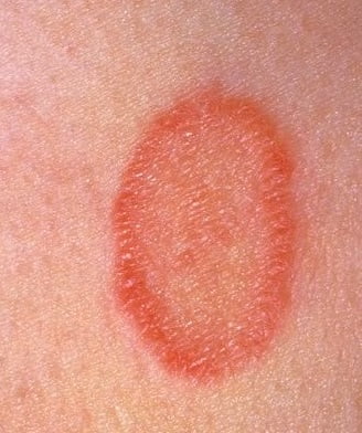 - Если лишай возникает на коже без волос, то он выглядит как бледно-розовые пятна с окантовкой по краям в виде валика.