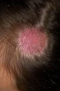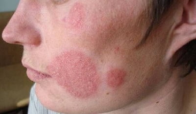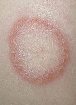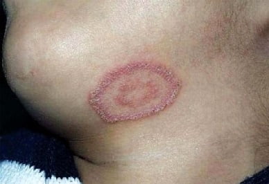 В месте внедрения гриба появляется отечное, возвышающееся красное пятно с четкими границами. Постепенно пятно увеличивается в диаметре. По краю формируется непрерывный возвышающийся валик, представленный мелкими узелками, пузырьками и корочками. В центральной части пятна происходит разрешение воспаления, вследствие чего она приобретает бледно-розовую окраску, с отрубевидным шелушением на поверхности. Таким образом, очаг имеет вид кольца.