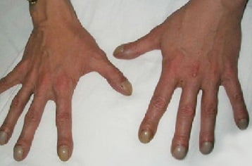 - Цианоз кожных покровов сначала кончиков пальцев, кончика носа шей, губ — что называется акроцианозом. При прогрессировании болезни, синюшность нарастает по всему телу.