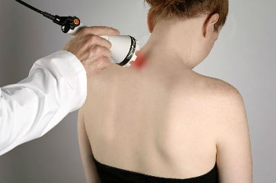 - Лазеротерапия. Улучшает кровообращение в зоне поражения, снимает отечность тканей, боль.