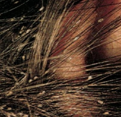 - Головной педикулез. Проявляется интенсивным зудом в области головы, из-за чего больной постоянно чешет голову. При осмотре кожи головы выявляются участки повреждения кожи на месте укусов с ярко желтыми «медовыми» корками, а также признаки фолликулита — воспаление волосяной луковицы, экземоподобное поражение кожи на затылке, у висков и за ушами. У больных головным педикулезом при осмотре головы на волосах можно обнаружить гниды — яйца, отложенные насекомыми. Они могут быть полными, белесоватыми или желтоватыми, при раздавливании между ногтями они щелкают. Пустые гниды выглядят серыми. Может выявляться лимфаденит в области ушей и шеи. При длительном и запущенном педикулезе образуются колтуны из волос, спутанных и склеенных гнойным отделяемым из ранок.