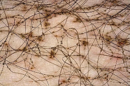 - Лобковой педикулез. При лобковом педикулезе беспокоит незначительный зуд кожи, на местах укусов возникают круглые или овальные пятна серо-голубого цвета размерами до 1 сантиметра. При надавливании на эти пятна, они резко бледнеют. Площицы имеют малую подвижность, они могут обнаруживаться у корня волоса.