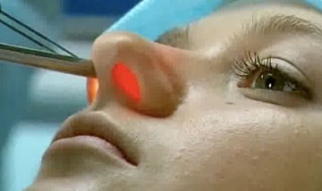 Эту процедуру можно провести амбулаторно, то есть в больницу ложиться не обязательно. В этот день лучше не есть. Больному вводят в область полипа обезболивающий препарат. В полость носа вводят эндоскоп с камерой и лазерное оборудование. С помощью лазерного луча врач нагревает клетки, из которых состоит полип, и они испаряются. В ходе операции лазер запаивает сосуды, и кровотечение не возникает. Также при этой процедуре возможность занесения инфекции полностью исключается. Это наименее травматичная процедура, она подходит для людей страдающих астмой и детей.