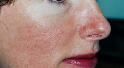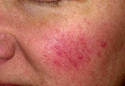 - Эритематозно-телеангиэктатическая. Эритема носит персистирующий характер (держится в течение нескольких дней). На коже щек появляются множественные телеангиэктазии.