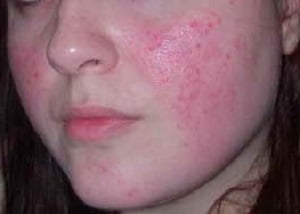 - Розовая сыпь, которая появляется на фоне покраснения. Сначала это папулы (розовые бугорки), которые потом преобразуются в прыщи с гнойным содержимым (пустулы, угри). Эта стадия называется папуло-пустулезной.