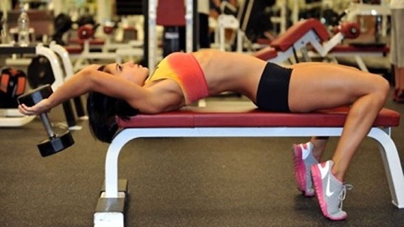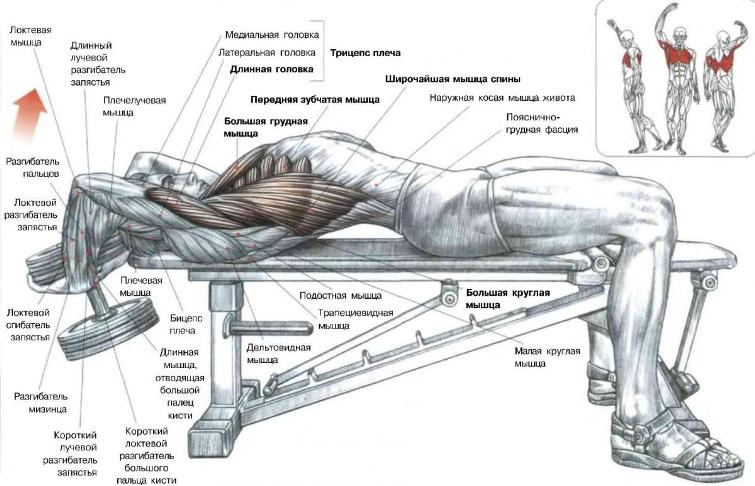 Возьмите в руки гантель и лягте на лавку так, чтобы голова находилась на её краю. Прижмите стопы к полу, обхватите гантель за блин обеими руками ладонями от себя и выпрямите руки. Разогните плечи до параллели с телом. Не сгибайте локти специально, но и не блокируйте суставы в прямом положении.
