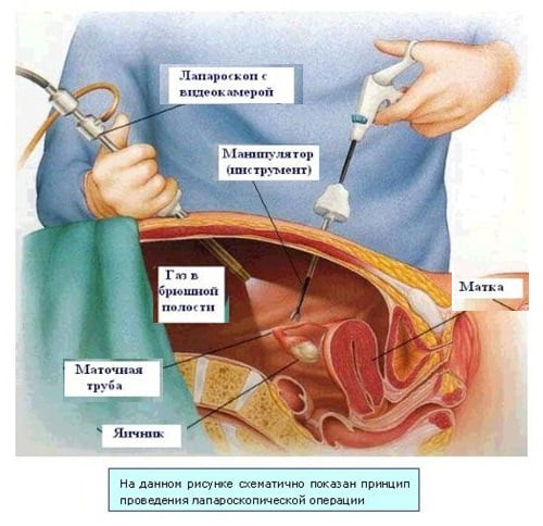 - Лапароскопия — оперативный, относительно щадящий метод избавления, поскольку позволяет не производить разреза брюшной полости, сохраняет маточную трубу, в нее проникают делая прокол. Это надежный метод диагностики и самый достоверный.