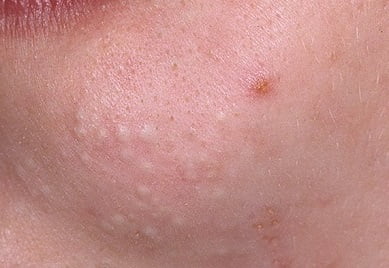 Закрытые комедоны — это небольшие бугорки телесного или белого цвета, слегка выступающие над поверхностью кожи. Со стороны они могут быть совсем незаметны и ощущаться лишь на ощупь, если провести рукой по коже. Чувствуются они как легкая шероховатость или неровность.